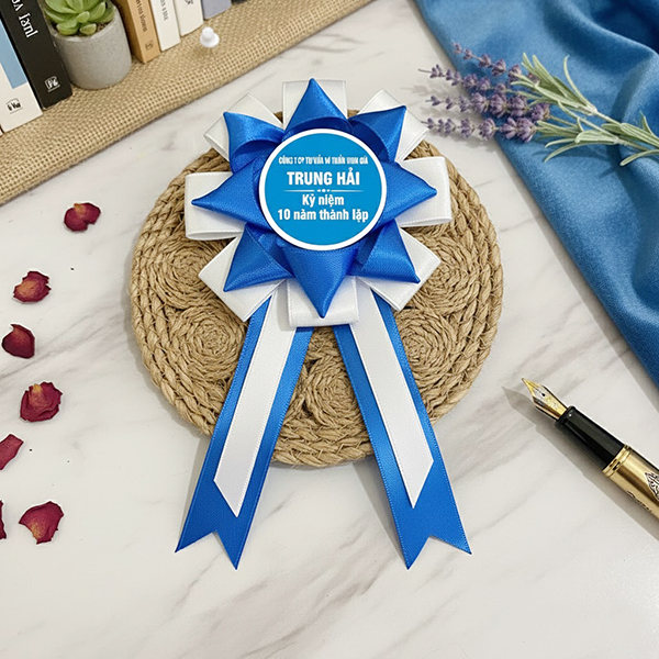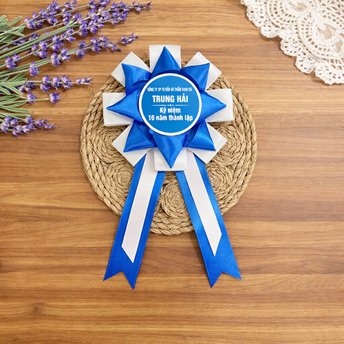 Bông hoa được tạo hình sao 8 cánh 2 lớp, các cánh xếp đều, chắc chắn và cân đối. Ở trung tâm là hình tròn in nội dung theo yêu cầu, kích thước 44mm, đảm bảo hiển thị rõ ràng logo, tên chương trình, khẩu hiệu hoặc thông điệp của sự kiện. Công nghệ in sắc nét, màu bền đẹp, không bong tróc, giúp hình ảnh luôn nổi bật trong suốt thời gian sử dụng.