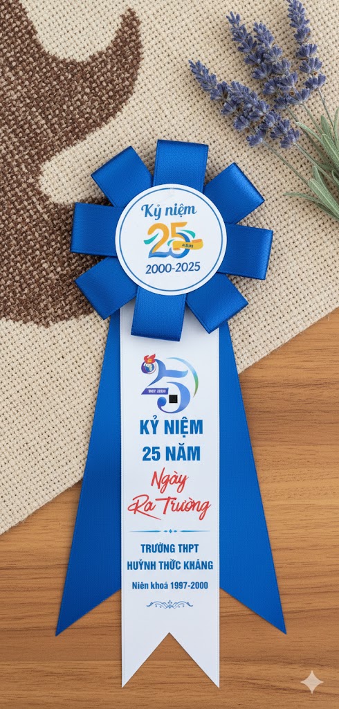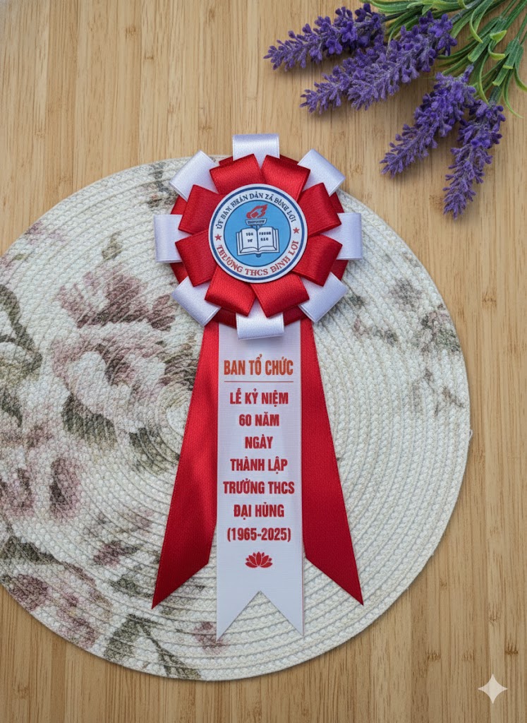 Màu sắc biểu tượng: Màu sắc của ruy băng có thể được chọn theo màu cờ truyền thống của trường hoặc màu sắc chủ đạo của buổi tiệc. Sự kết hợp giữa màu đỏ rực rỡ của nhiệt huyết và màu trắng tinh khôi của tuổi học trò như trong ảnh mẫu tạo nên hiệu ứng thị giác rất mạnh mẽ và giàu cảm xúc.