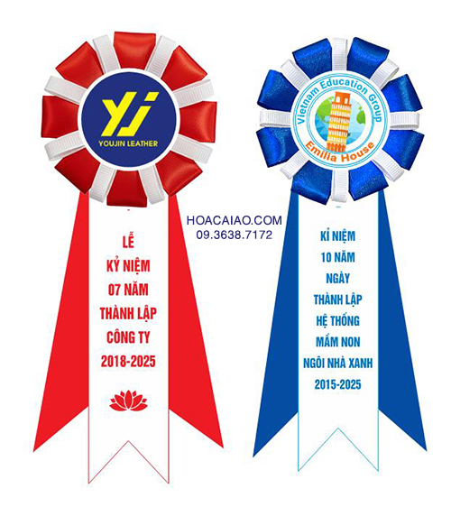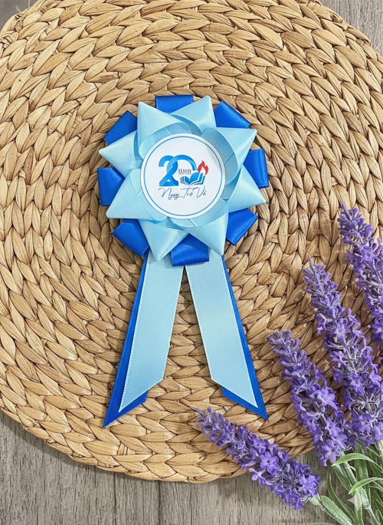 Hoa cài áo in nội dung (Badge/Ribbon): Thường kết hợp giữa hoa vải và dải ruy băng in tên lớp, niên khóa (Ví dụ: Kỷ niệm 20 năm ra trường - Niên khóa 1999 - 2002).