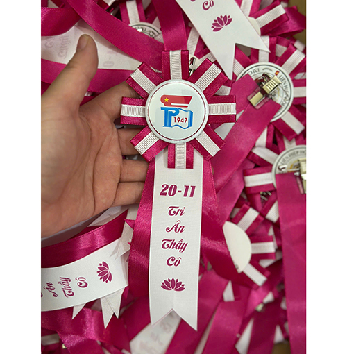 Thông thường, hoa cài áo ngày nhà giáo được thiết kế tinh xảo với ruy băng đa sắc, phổ biến nhất là sắc đỏ hoặc tím, tượng trưng cho sự nhiệt huyết, lòng trung thành và tri thức. Trung tâm của hoa thường được in logo "20-11", hình ảnh cuốn sách, hoặc dòng chữ "Tri Ân Thầy Cô" đầy ý nghĩa. Mỗi chiếc hoa cài áo là lời cảm ơn chân thành, thể hiện sự kính trọng và tình cảm sâu sắc của học sinh, phụ huynh và toàn xã hội gửi đến những người lái đò thầm lặng. Chúng không chỉ là phụ kiện làm đẹp mà còn là dấu hiệu nhận diện đặc biệt, tôn vinh vai trò cao quý của nghề giáo.