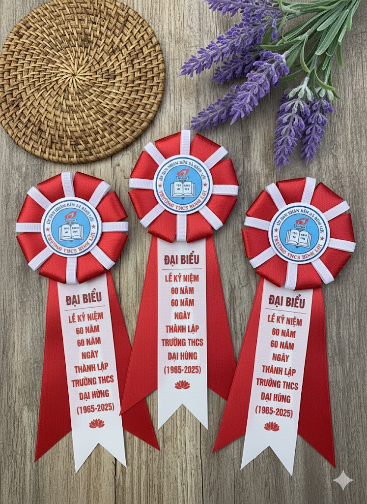 Màu sắc biểu tượng: Màu sắc của ruy băng có thể được chọn theo màu cờ truyền thống của trường hoặc màu sắc chủ đạo của buổi tiệc. Sự kết hợp giữa màu đỏ rực rỡ của nhiệt huyết và màu trắng tinh khôi của tuổi học trò như trong ảnh mẫu tạo nên hiệu ứng thị giác rất mạnh mẽ và giàu cảm xúc.