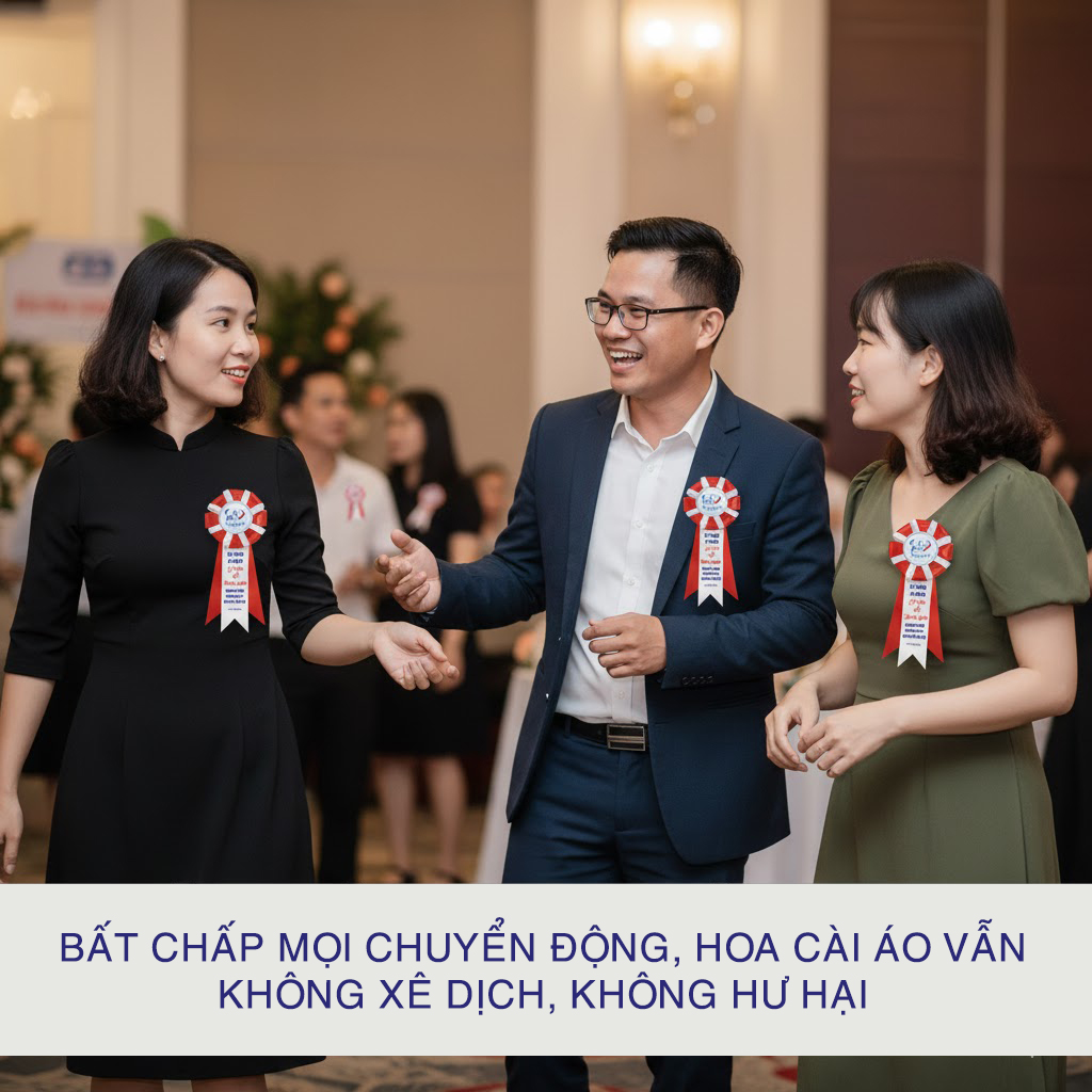 Hoa cài áo hội nghị không đơn thuần là vật trang trí, nó còn giúp phân loại các nhóm khách mời (VIP, Ban tổ chức, Khách mời) một cách khéo léo và thẩm mỹ. Xu hướng năm 2024-2025 là các mẫu hoa cài tối giản nhưng sang trọng, sử dụng tông màu nhã nhặn hoặc màu sắc đặc trưng của doanh nghiệp.
