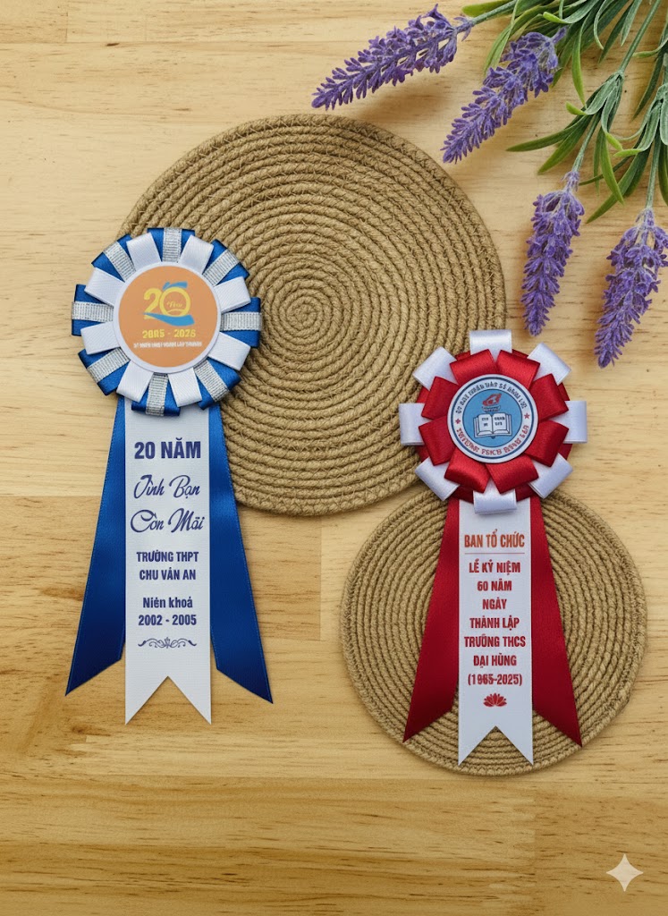 Hoa cài áo in nội dung (Badge/Ribbon): Thường kết hợp giữa hoa vải và dải ruy băng in tên lớp, niên khóa (Ví dụ: Kỷ niệm 20 năm ra trường - Niên khóa 1999 - 2002).